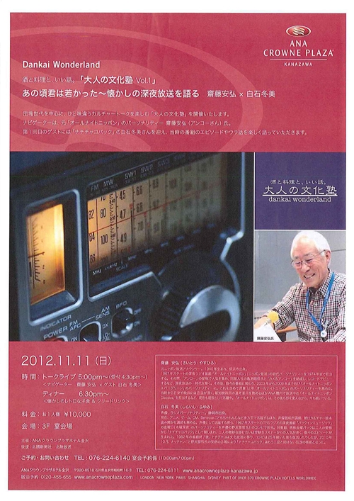 団塊世代を中心に、ひと味違うカルチャートークとディナーを楽しむ「大人の文化塾」を開催致します。ナビゲーターは、元「オールナイトニッポン」のパーソナリティー齋藤安弘(アンコーさん)氏。