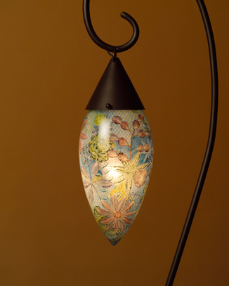 エナメル彩ガラス器づくりの第一人者、林久美子のオリジナルランプシェードの付いたライトスタンドです。